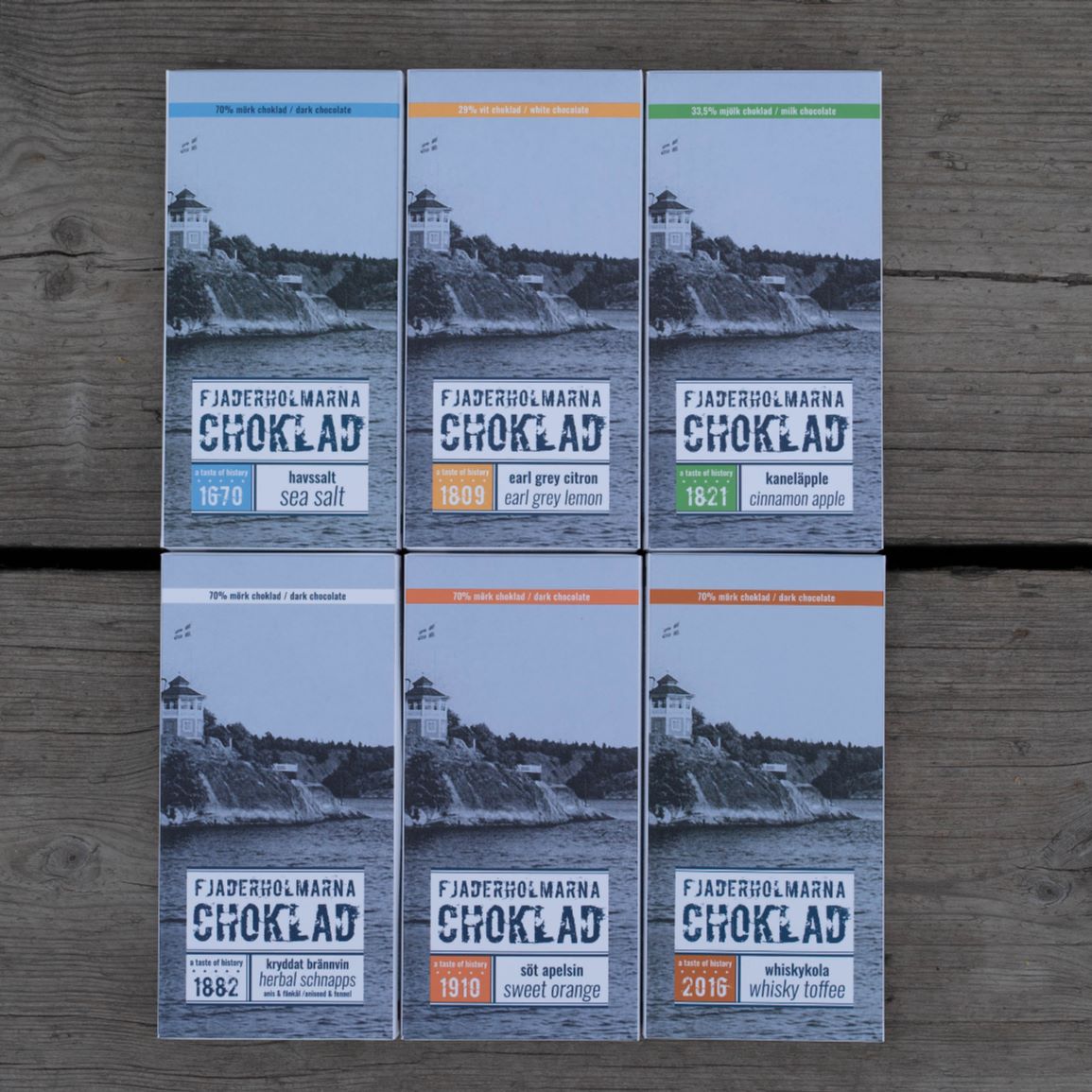 Fjäderholmarna har en spännande historia som vi har plockat upp i smaksättningen av både praliner, bräck och chokladkakor. Vi startar med sex stycken grundsmaker som alla har en anknytning till händelser på Fjäderholmarna. Fler smaker kommer att experimenteras och testas. Håll utkik här och framförallt i butiken. Nu börjar vi med år 1670, 1809, 1821, 1882, 1910, 1985 (mörk 85% ej i bild) och 2016.